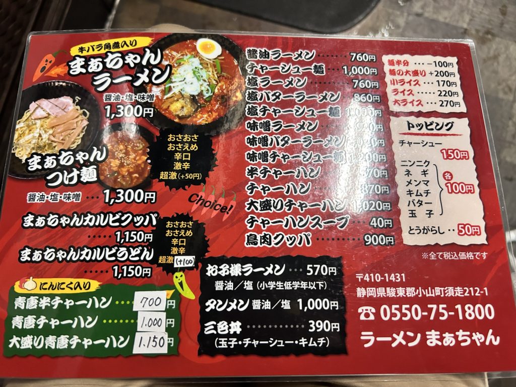 静岡遠征で激辛ラーメンが食べられるお店を探していた時に見つけたのが「ラーメンまぁちゃん」。土地勘の無いところ、ドキドキしながら訪問したところ、街の皆さんで賑わうアットホームなお店でした。暖かい雰囲気の中、美味しい激辛ラーメンを堪能してきましたので、ご紹介しましょう。