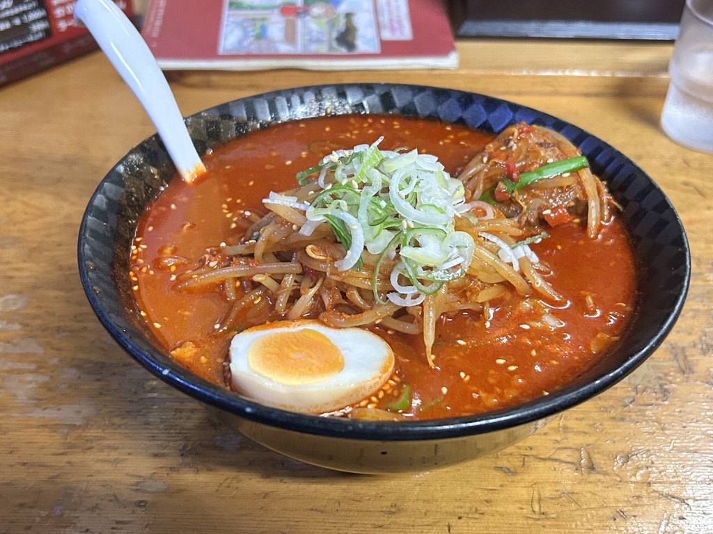 着丼した味噌ラーメン超辛ハバネロ2倍がこちら!真っ赤なスープにねぎ、もやし、にら、ゆで卵、そしてブロックチャーシューがトッピングされています。