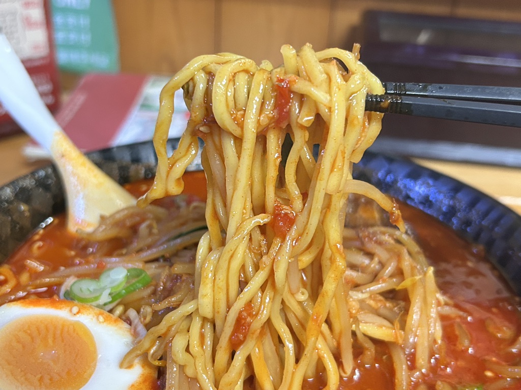 中太のストレートに近い少し縮れた麺には、スライスの唐辛子が絡んできます。これもまた辛さに拍車をかけます。麺は噛むほど小麦の味わいが口の中に広がり、旨みを奏でます。