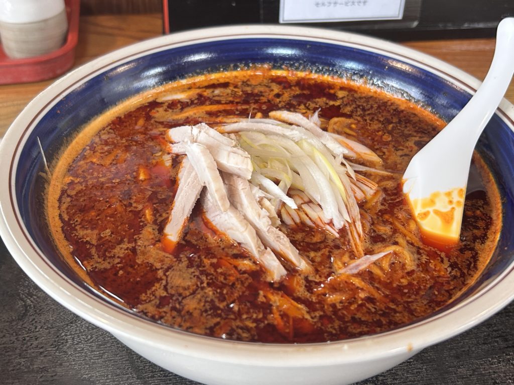 真っ赤なラーメンが着丼しました。ラー油が丼の表面を覆い、明らかに真っ赤、辛い香りが漂います。長ネギ、チャーシューがトッピング。