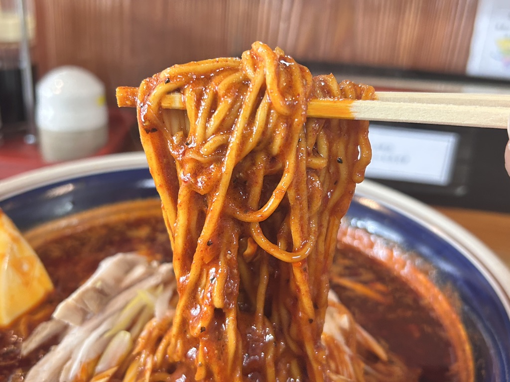 中太麺にがっつりドロドロのスープが絡み、ワクワク感と食欲をそそります。唐辛子のつぶつぶとニンニクの風味が絶妙な美味しさを奏でます。